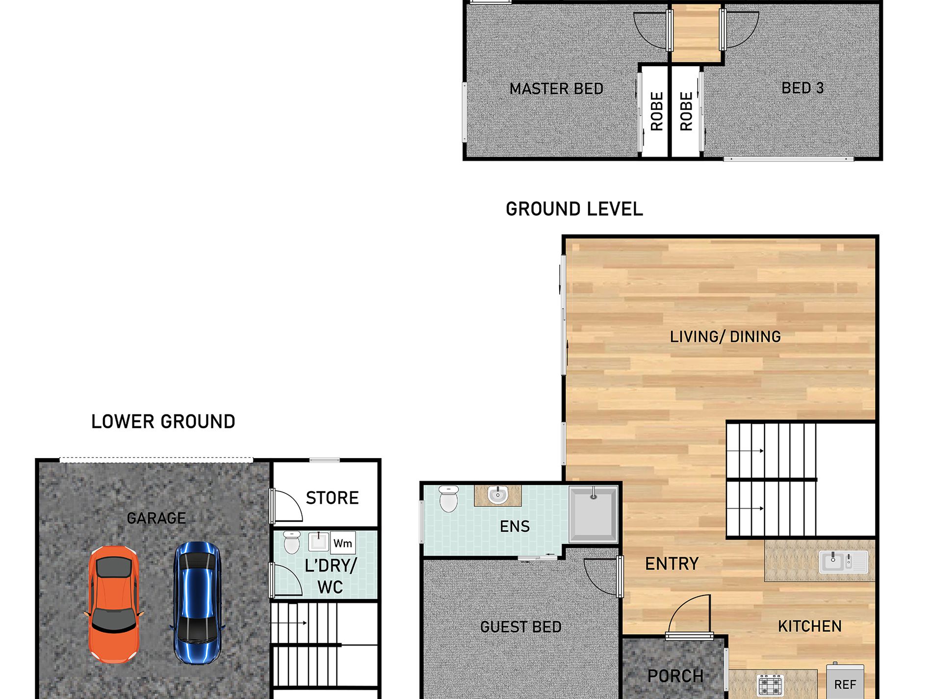 • Three spacious Bedrooms across three well-zoned levels, offering privacy and versatility.